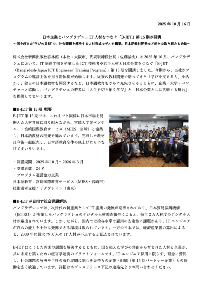 株式会社新興出版社啓林館(本社:⼤阪市、代表取締役社⻑:佐藤諭史)は 2025 年 10 ⽉、バングラデシュにおいて、IT 関連学部を卒業した ICT 技術者や若⼿⼈材と⽇本企業をつなぐ「B-JET(Bangladesh-Japan ICT Engineersʼ Training Program)」第 15 期を開講しました。今期から、当社がプログラムの運営主体を担う新体制が始動します。従来の教材開発で培ってきた「学びを⽀える⼒」を活かし、独⾃の⽇本語教材を開発するなど、⽇本語教育をさらに充実させるとともに、企業・⼤学・ベンチャーと協働し、バングラデシュの若者に「⼈⽣を切り拓く学び」と「⽇本企業と共に挑戦する舞台」を提供してまいります。